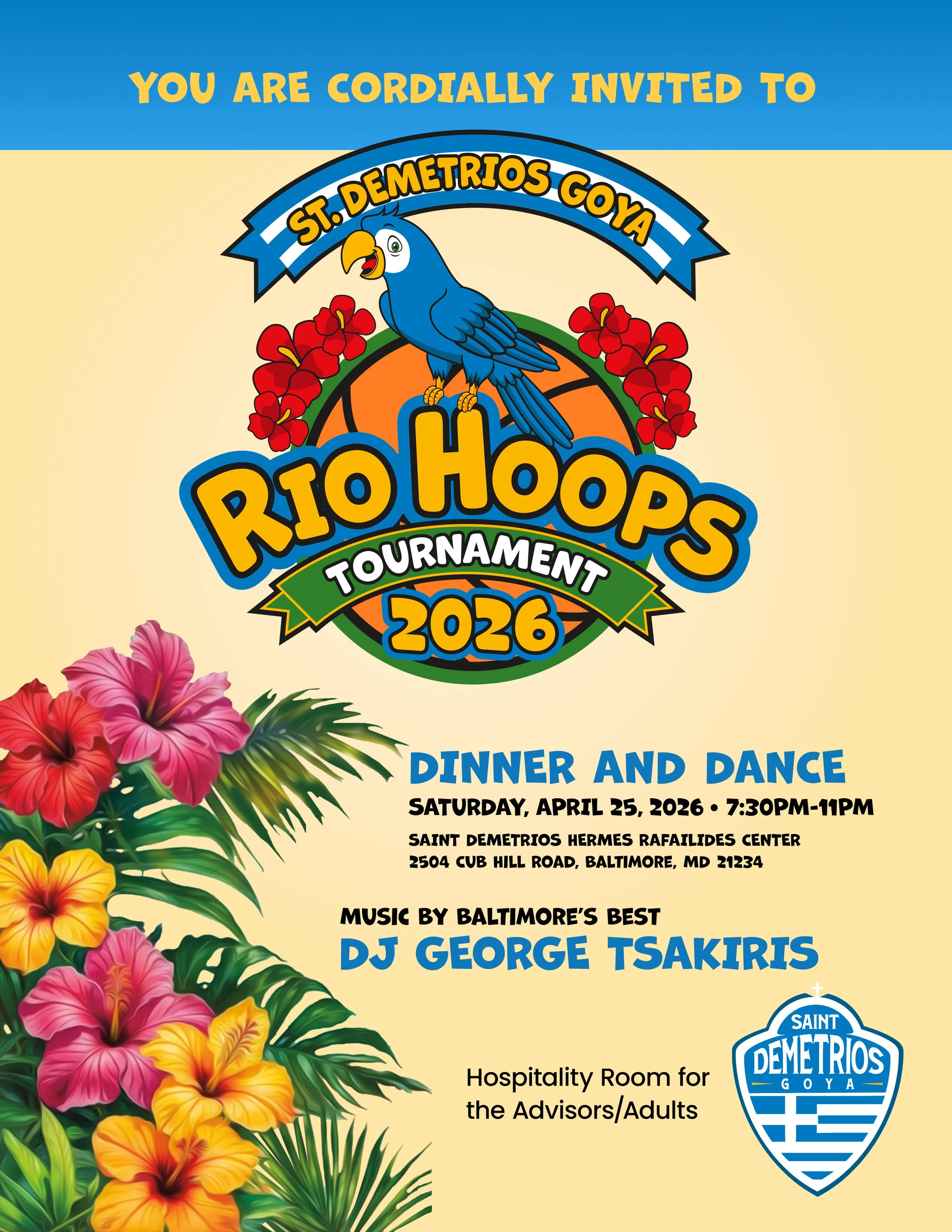 Join us Saturday, April 25, 2026, from 7:30 - 11 PM for our themed dance, “A Night in Rio,” at the Saint Demetrios Hermes Rafailides Center. Dinner will be provided.